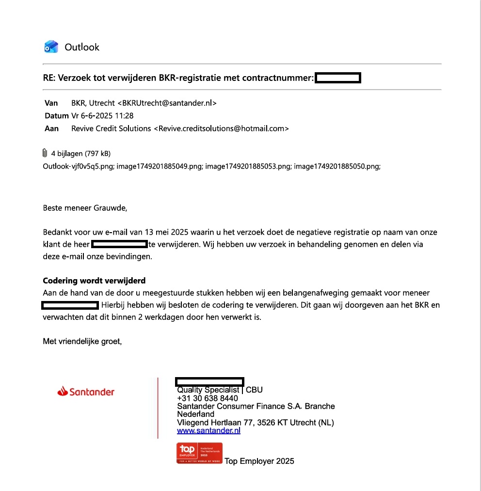 Ik had 2 BKR coderingen staan bij ING. Revive Credit Solutions heeft beide coderingen (A en A3) vervroegd voor mij kunnen verwijderen. Communicatie was top en ze zijn zeer deskundig. Nu kan ik eindelijk opzoek naar een koopwoning!